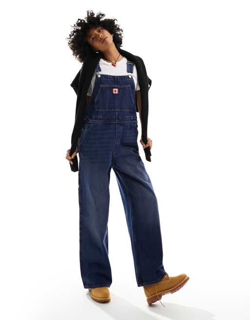 Monki - Denim tuinbroek met aardbeiborduursel en wassing in middenblauw