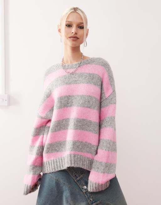 Monki - Gebreide trui met ronde hals in blauw met roze en grijze strepen
