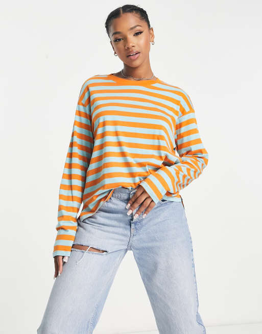 Monki - Gestreept T-shirt met lange mouwen in groenblauw en oranje