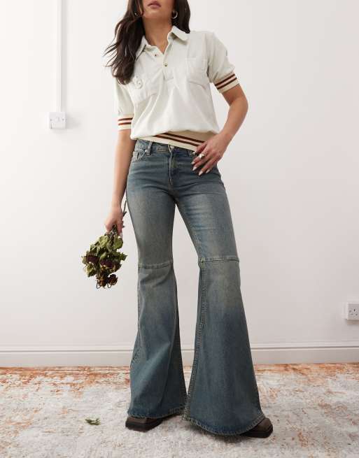 Monki - Kiki - Losvallende flared jeans met lage taille in canyon blauw met donkere wassing
