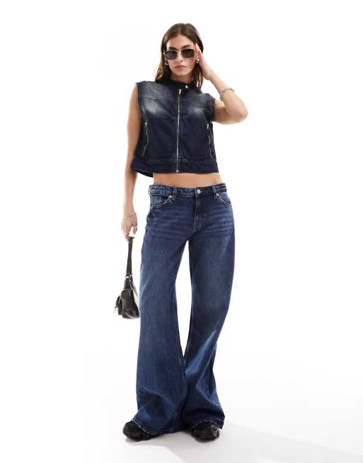 Monki - Kiri - Losvallende flared jeans met lage taille in donkerblauwe wassing