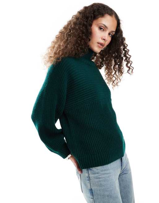 Monki - Libby - Geribbeld gebreide hoogsluitende trui in bosgroen