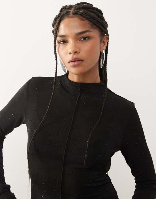Monki - Mesh top met siersteentjes en lange mouwen in zwart