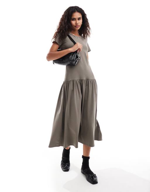 Monki - Midi jurk van zachte jersey met korte mouwen, open hals en verlaagde taille in grijs