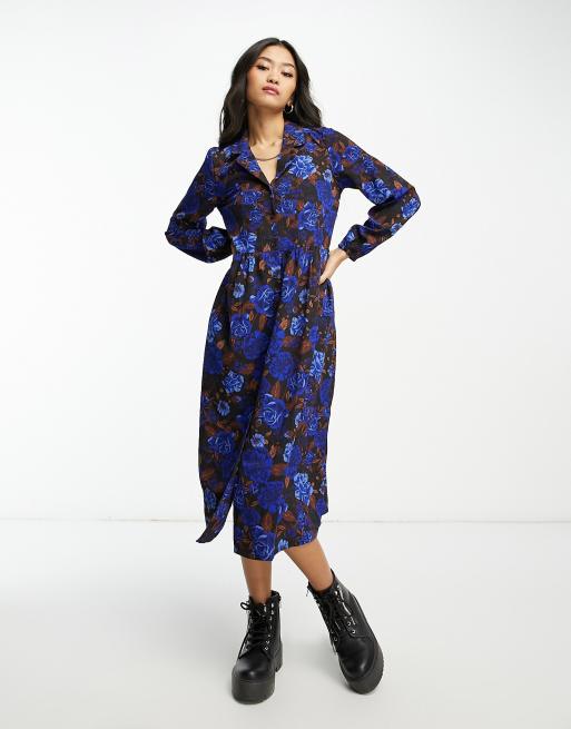 Monki - Midi overhemdjurk in blauw met bruine bloemenprint