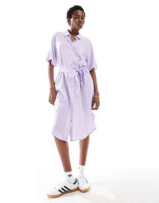 Monki - Midi-overhemdjurk met gestrikte taille en fijne print in donker lila, exclusief bij ASOS