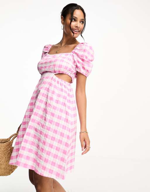 Monki - Mini-jurk met ballonmouwen, uitsnijdingen en roze gingham ruit