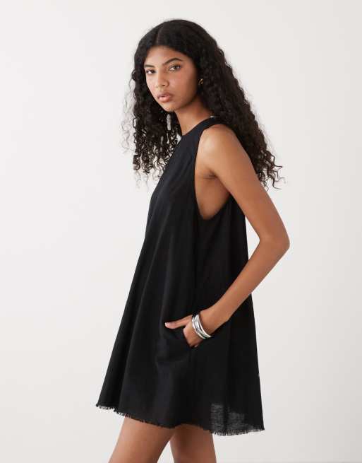 Monki - Mouwloze mini jurk van linnenmix met A-lijn en gerafelde rand in zwart