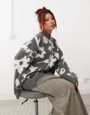 Monki - Oversized gebreide sweater met bloemenprint in grijs
