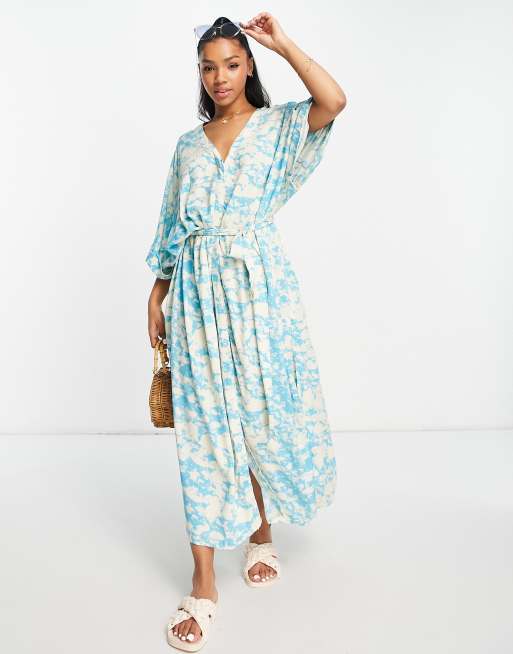 Monki - Oversized midi-jurk met kimonomouwen en split vooraan in abstracte print