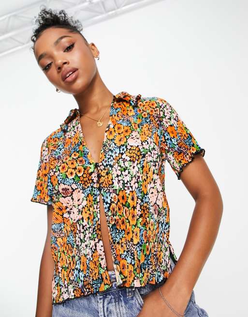 Monki - Plissé overhemd met knoopsluiting aan de voorkant en regenboogbloemenprint