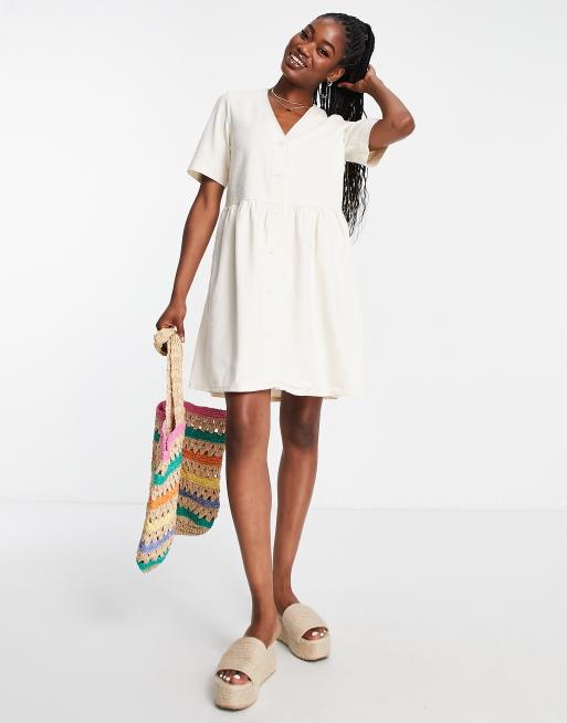 Monki - Ruimvallende, aangerimpelde jurk met knoopsluiting in ecru denim