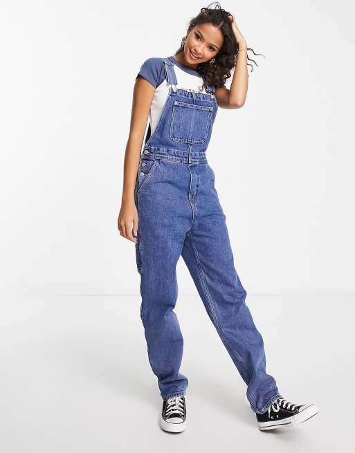 Monki - Ruimvallende denim tuinbroek met contrasterende detail in lichte wassing