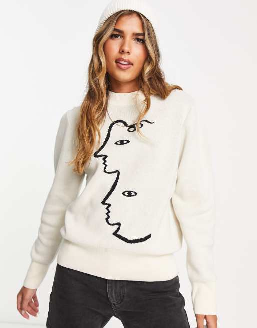 Monki - Ruimvallende gebreide trui met abstract motief in wit