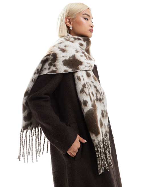 Monki - Zachte grofgebreide sjaal met bruine koeienprint