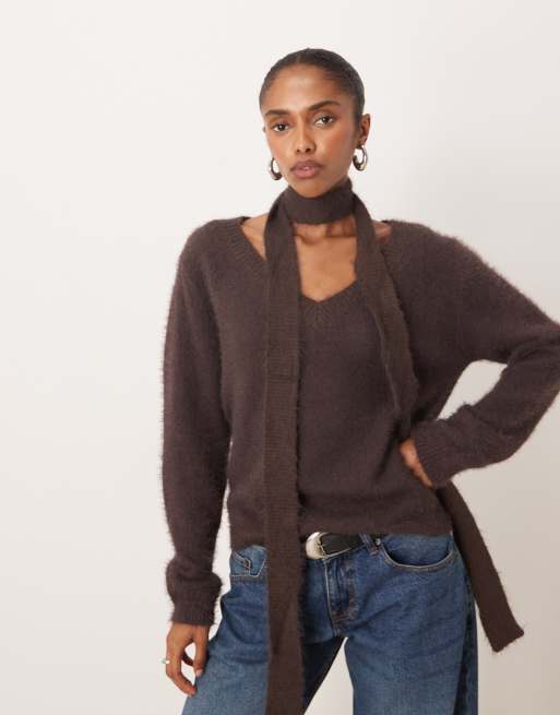 Motel - Dikara - Pluizige ruimvallende trui met V-hals en bijpassende sjaal in bruin