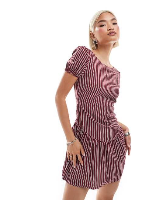 Motel - Exclusives - Jemima - Gestreepte mini-jurk met pofmouwen in bordeauxrood en blauw