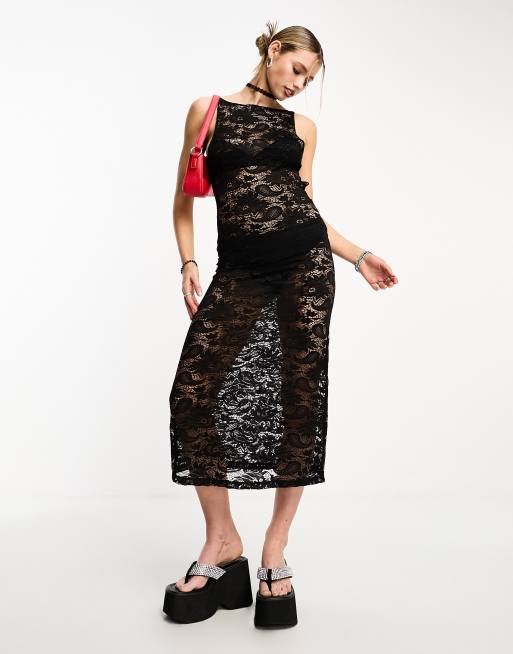 Motel - Midaxi kanten slipdress met rechte hals in zwart