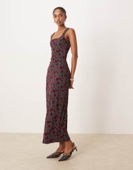 Motel - Sayidan - Midi-jurk met vierkante hals en bloemenprint in blauw en bordeauxrood
