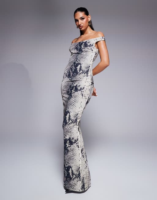 Murci - Maxi bodycon jurk met blote schouders in grijze slangenprint