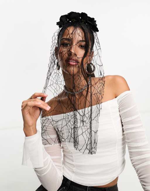 My Accessories London - Halloween - Haarband met bloemen en spinnenweb-sluier in zwart