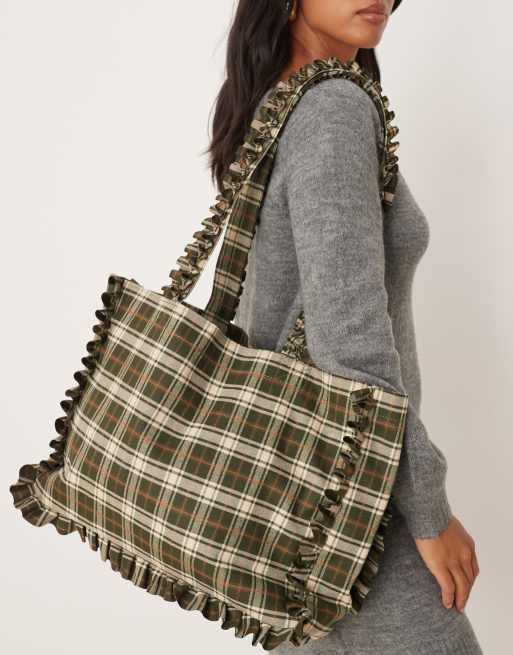 My Accessories - Tote tas met ruches en olijfgroene ruitprint