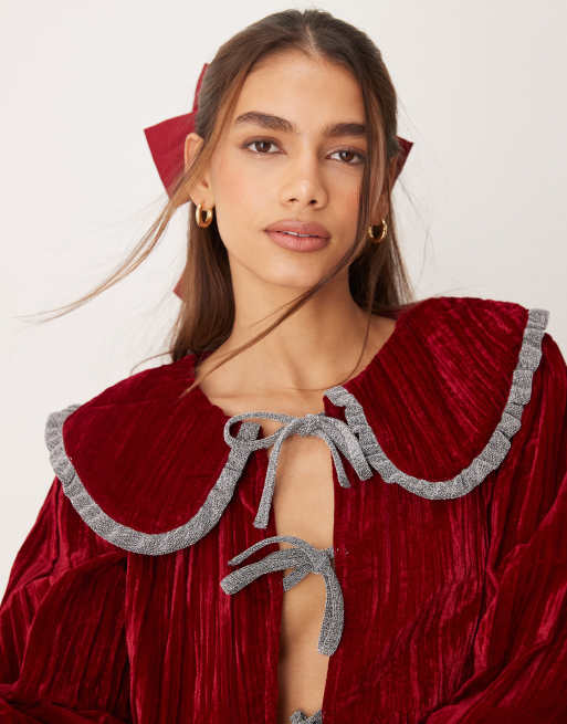 Neon Rose - Blouse van gekreukt fluweel met strikdetail in bordeauxrood, deel van co-ord set