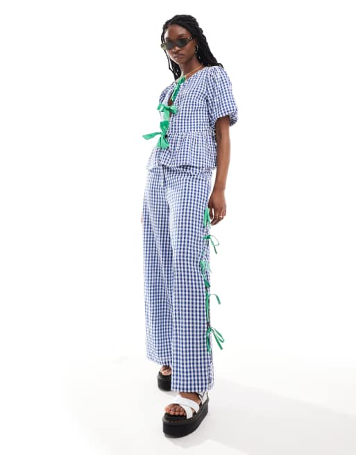 Neon Rose - Broek met wijde pijpen, strikdetail en gingham ruit in blauw en groen