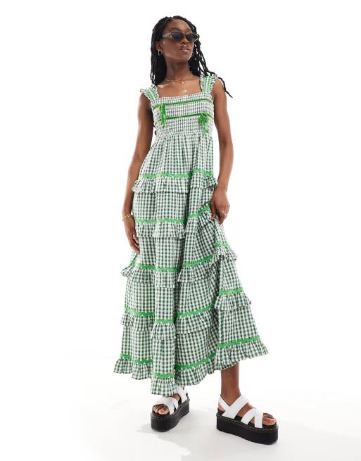 Neon Rose - Midaxi jurk met ruches, stroken en gingham ruit in bosgroen