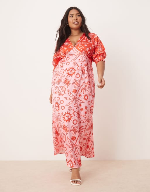 Never Fully Dressed Plus - Contrasterende midaxi-jurk met print in rood en roze