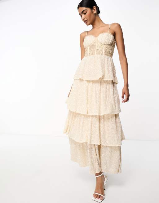 Never Fully Dressed - Bruidskleding - Maxi jurk van kant met korset, stroken en lovertjes in gouden ivoor