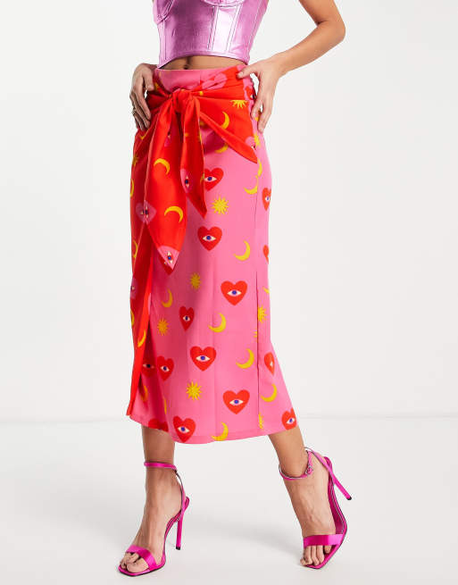Never Fully Dressed - Midirok met contrasterende overslag in roze met rood, deel van co-ord set