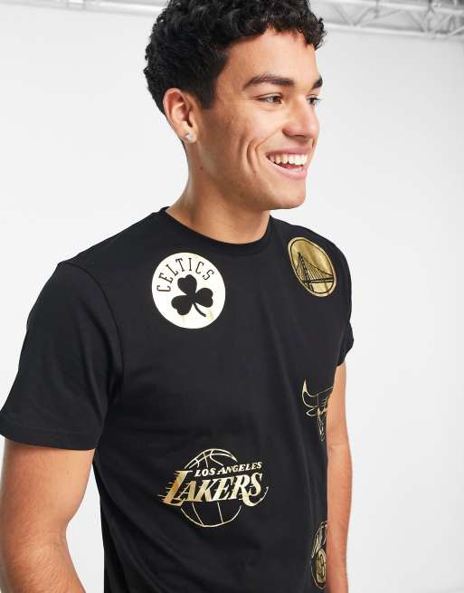 New Era - NBA - T-shirt in zwart met goudkleurige folieprint badges