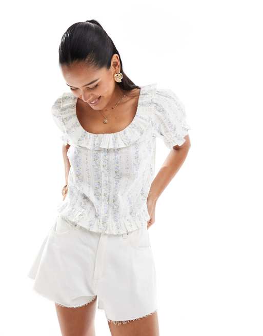 New Look - Blouse met blauwe bloemenprint in streepmotief en knopen