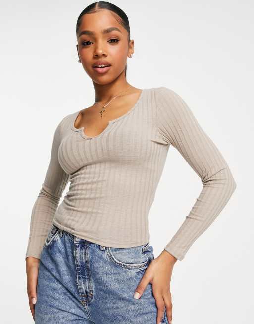 New Look - Geribbelde top met lange mouwen en inkeping aan de hals in nertsbruin