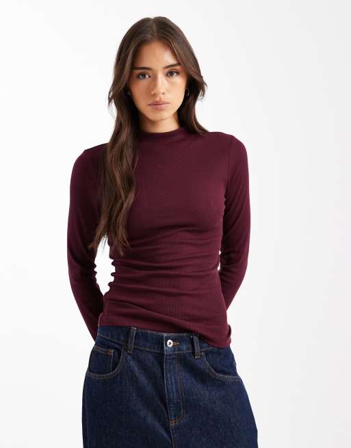 New Look - Geribbelde trui met lange mouwen en opstaande kraag in bordeauxrood