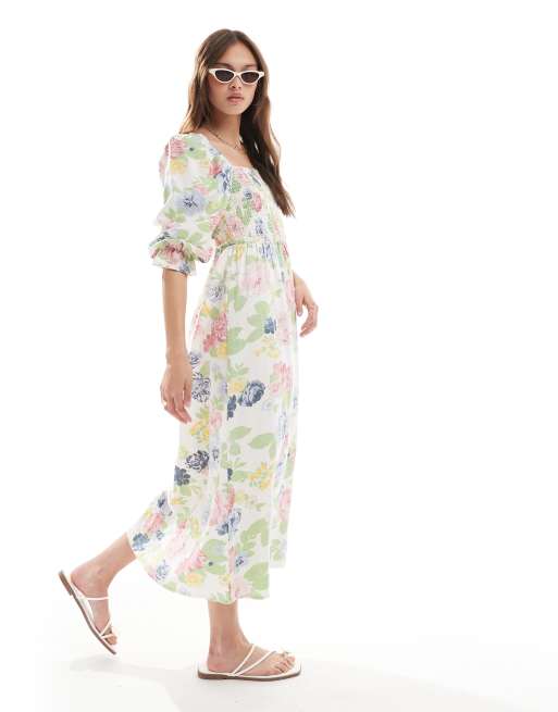 New Look - Gesmokte jurk met lange mouwen en bloemenprint in ecru