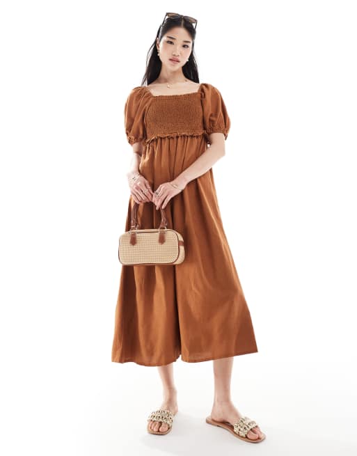 New Look - Gesmokte midi-jurk van linnenmix met pofmouwen in roestbruin