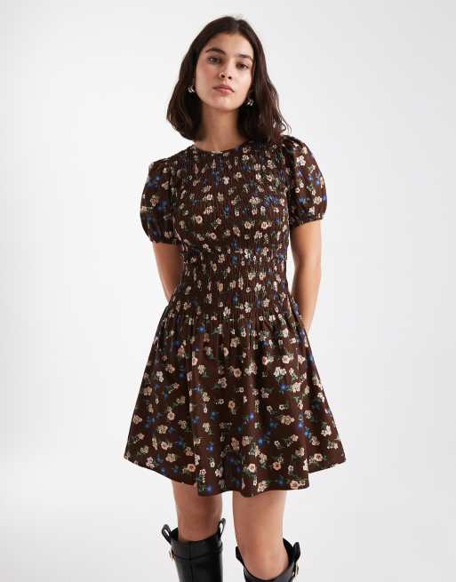 New Look - Gesmokte mini-jurk met fijne bloemenprint in bruin