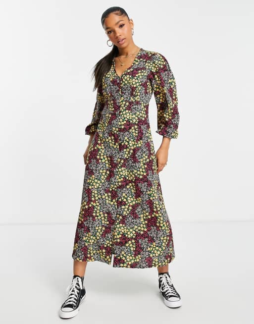 New Look - Midi-jurk met V-hals, knoopsluiting en fijne bloemenprint in groen