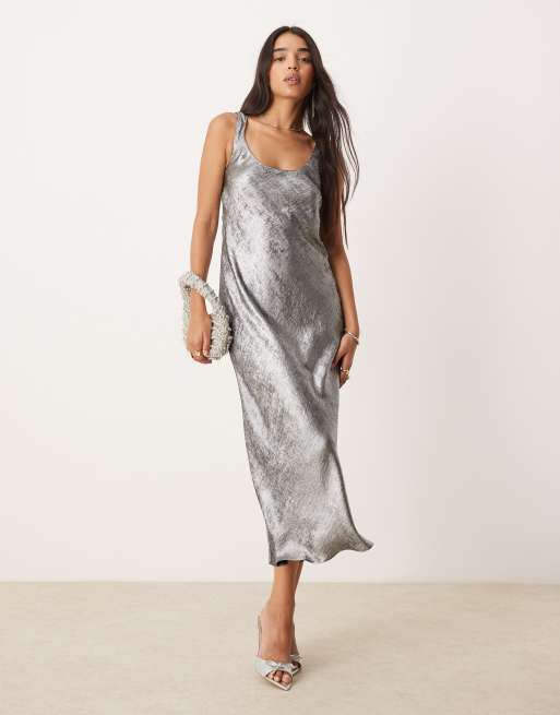 New Look - Midi jurk van foliesatijn met lage ronde hals in zilver