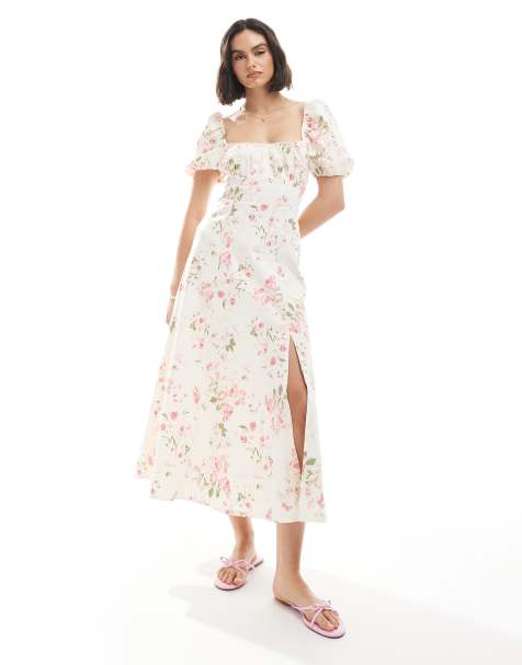 New Look - Midi melkmeisjesjurk met pofmouwen in crème met bloemenprint