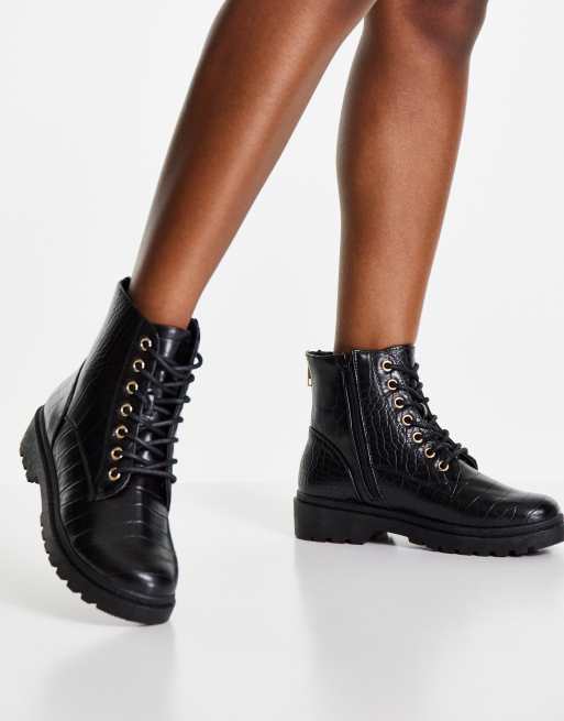 New Look - Platte veterlaarzen met ritsje en croc-motief in zwart