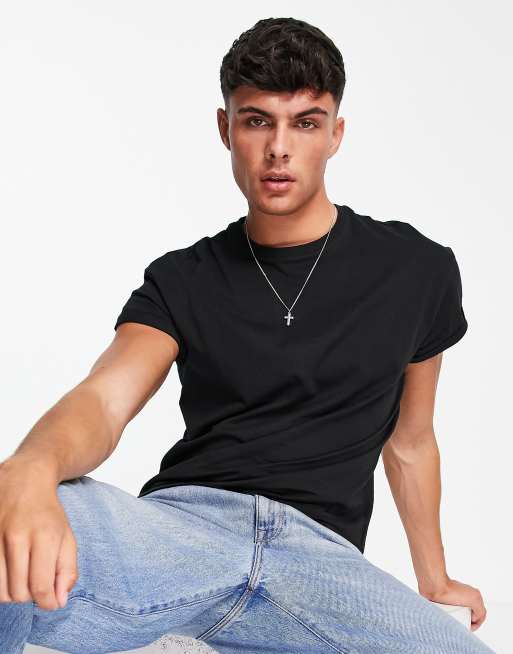 New Look - T-shirt met omgeslagen mouwen in zwart