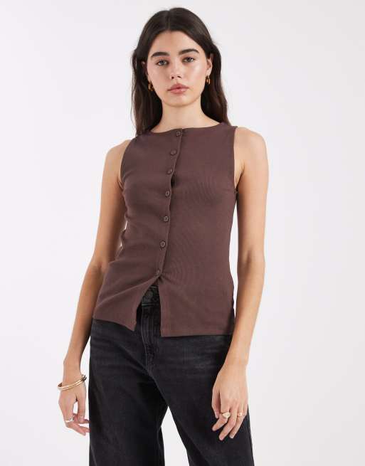 New Look - Tanktop met boothals en knoopsluiting in bruin