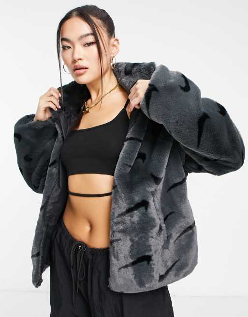 Nike - Jack van imitatiebont met swoosh-print in rookgrijs en zwart