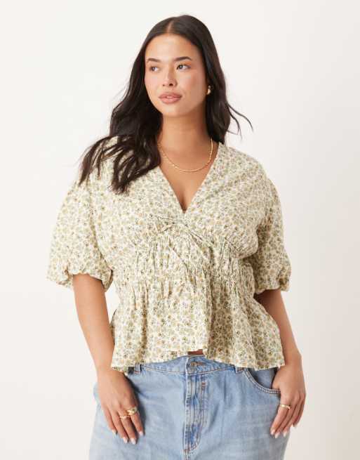 Nobody's Child Plus - Cordellia - Crop top met pofmouwen in fijne gele print