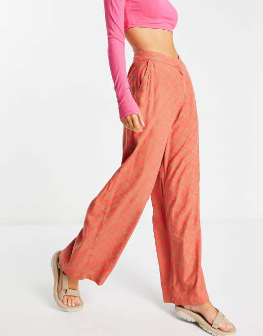 Noisy May - Broek met wijde pijpen en koraalrood monogram, deel van co-ord set