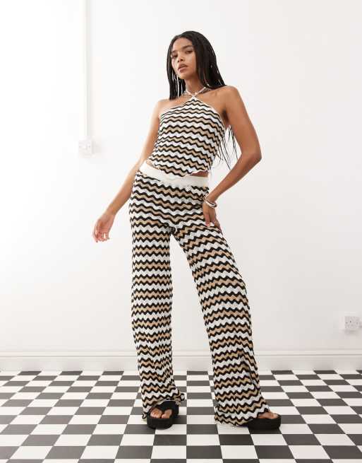 Noisy May - Gehaakte co-ord set van top en broek met golfpatroon in zwart en beige