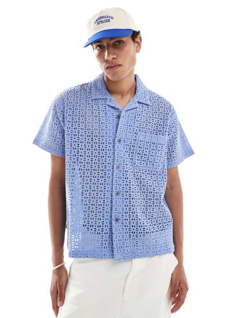 Obey - Geborduurd, opengewerkt overhemd met korte mouwen in blauw